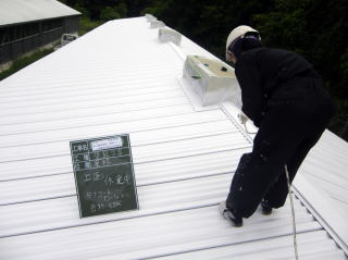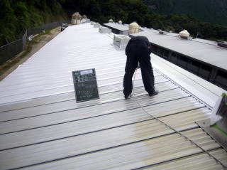| 8.上塗り作業中 タフコートD-47をエア−レス又はローラー・刷毛で塗布します 塗布量:0.15kg/u、5時間以上乾燥 ![]() |
